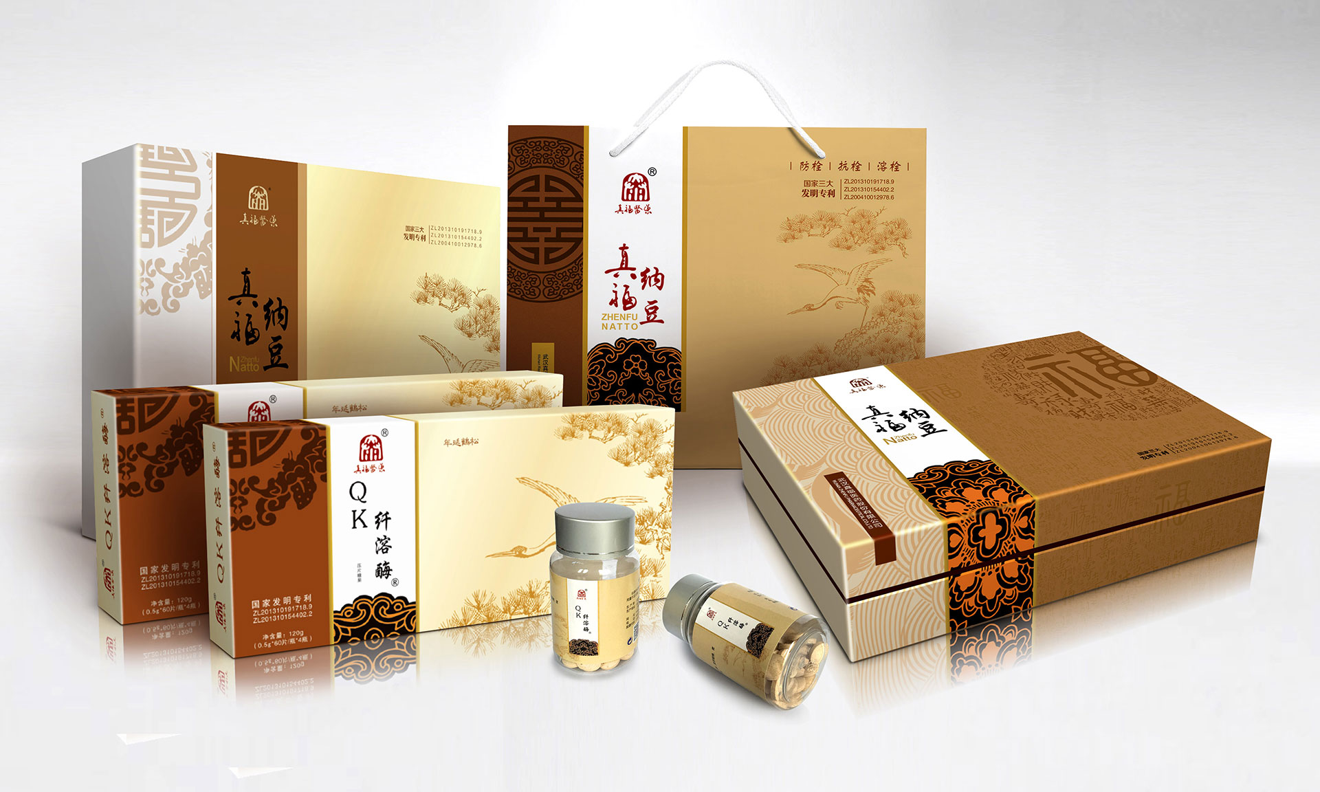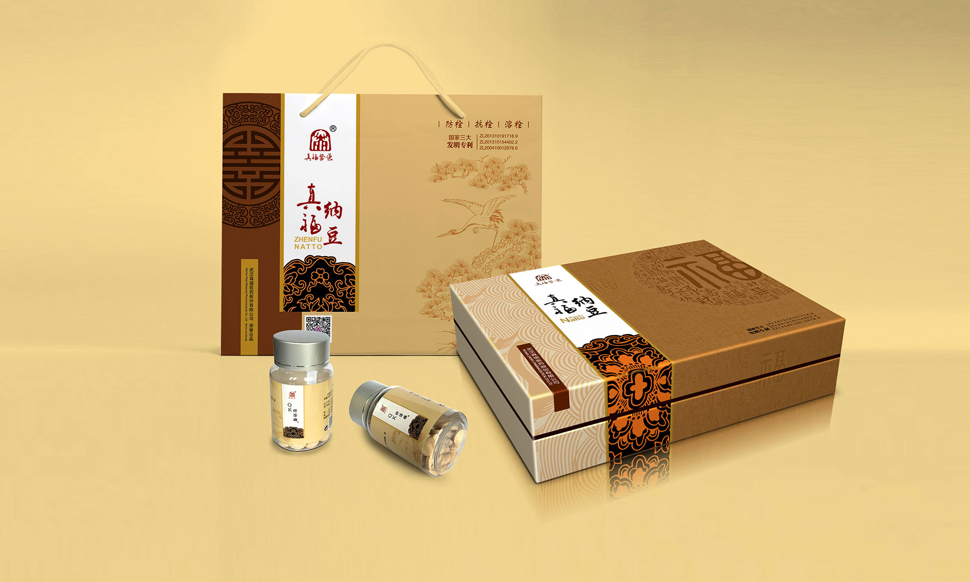 心腦血管疾病是人類健康的頭號(hào)殺手,中國(guó)人的死亡80%就是心腦管疾病。武漢大學(xué)生命科學(xué)院通過現(xiàn)代生物技術(shù),在農(nóng)產(chǎn)品大豆中提煉出枯草桿菌研制成的真福納豆,獲得國(guó)家三項(xiàng)發(fā)明專利。該產(chǎn)品對(duì)緩解和輔助治療心腦血管疾病有著顯著的效果,同時(shí)不對(duì)人產(chǎn)生任何傷害。是一種綠色健康的產(chǎn)品。信立浩達(dá)設(shè)計(jì)團(tuán)隊(duì)對(duì)產(chǎn)品價(jià)值深度挖掘,在產(chǎn)品包裝設(shè)計(jì)上用中國(guó)傳統(tǒng)的“福祿壽禧、松鶴延年”文化來表達(dá),同時(shí)反復(fù)訴求:讓中國(guó)人多活十年!這樣產(chǎn)品的價(jià)值,通過福壽文化、松鶴文化得到了形象的傳遞,深受中老年人的心理認(rèn)同。