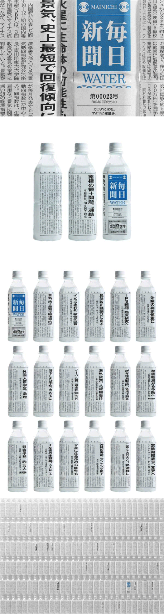 日本的每日新聞發(fā)現(xiàn),買報紙的年輕人數(shù)量不斷降低,而買瓶裝礦泉水的年輕人卻有所增加。于是設(shè)計師 Yoshinaka Ono為每日新聞設(shè)計出承載新聞的礦泉水瓶,一個月內(nèi)將 31 款新聞瓶子成功推入市場。一個意外收獲是,用報紙做產(chǎn)品包裝,逼格不僅沒有降低,而且在貨架上的識別度也很高。最終在一個月的時間里,幾乎每一個零售超市平均售出3000瓶這樣的News Bottle礦泉水。可以說,《每日新聞》既挽提高了銷量,又將用戶引向了移動端,包裝的作用意義非凡。